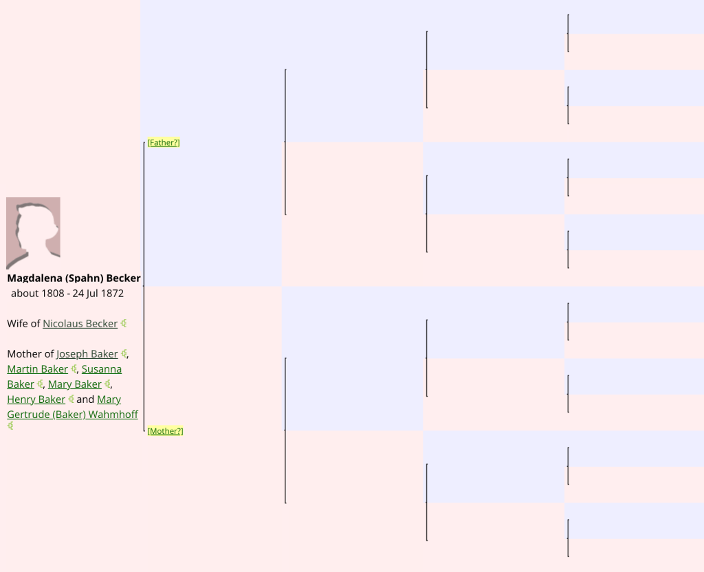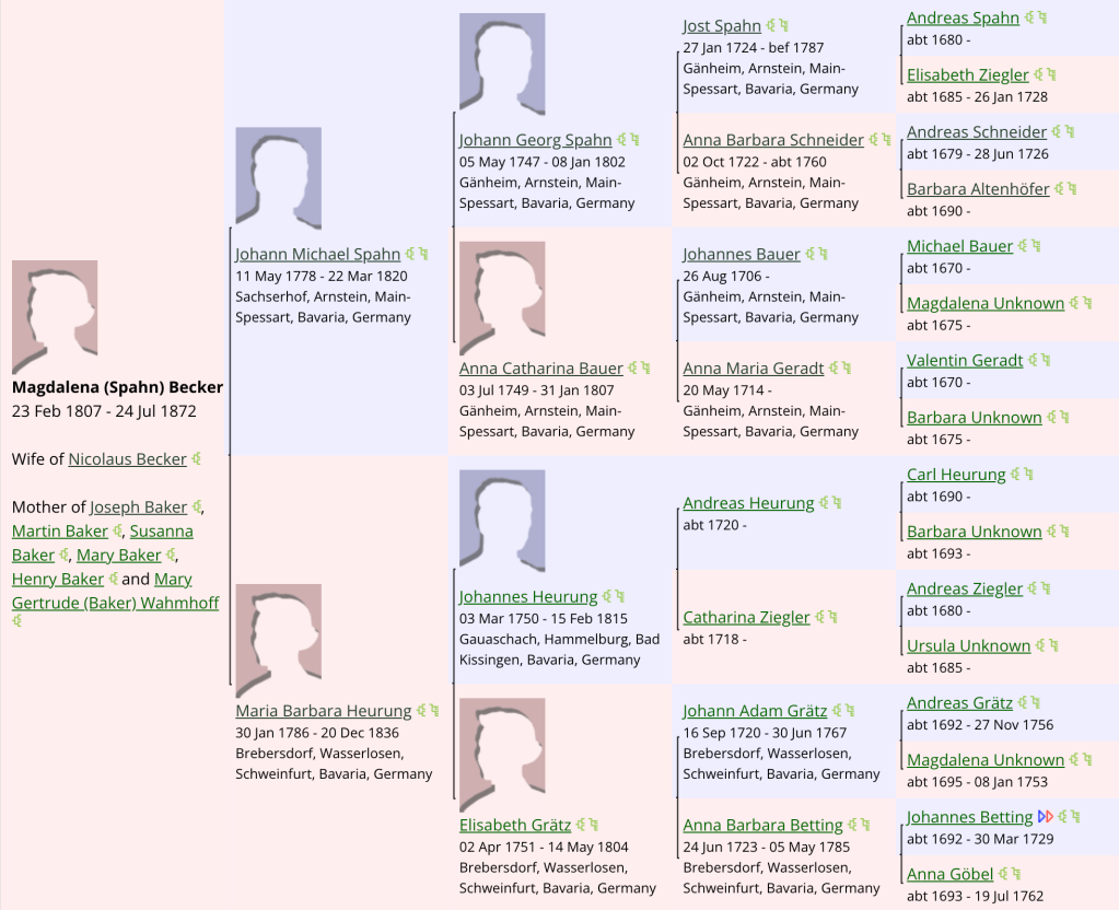 With a bit of luck (only A-G parish records are available so far, as they are posted in alphabetical order), I found my 4th great-grandmother Magdalena (SPAHN) BECKER and her parents. Not even a full week later, and her pedigree has had amazing development – from the blank slate just a few weeks ago to the rather full version below it: